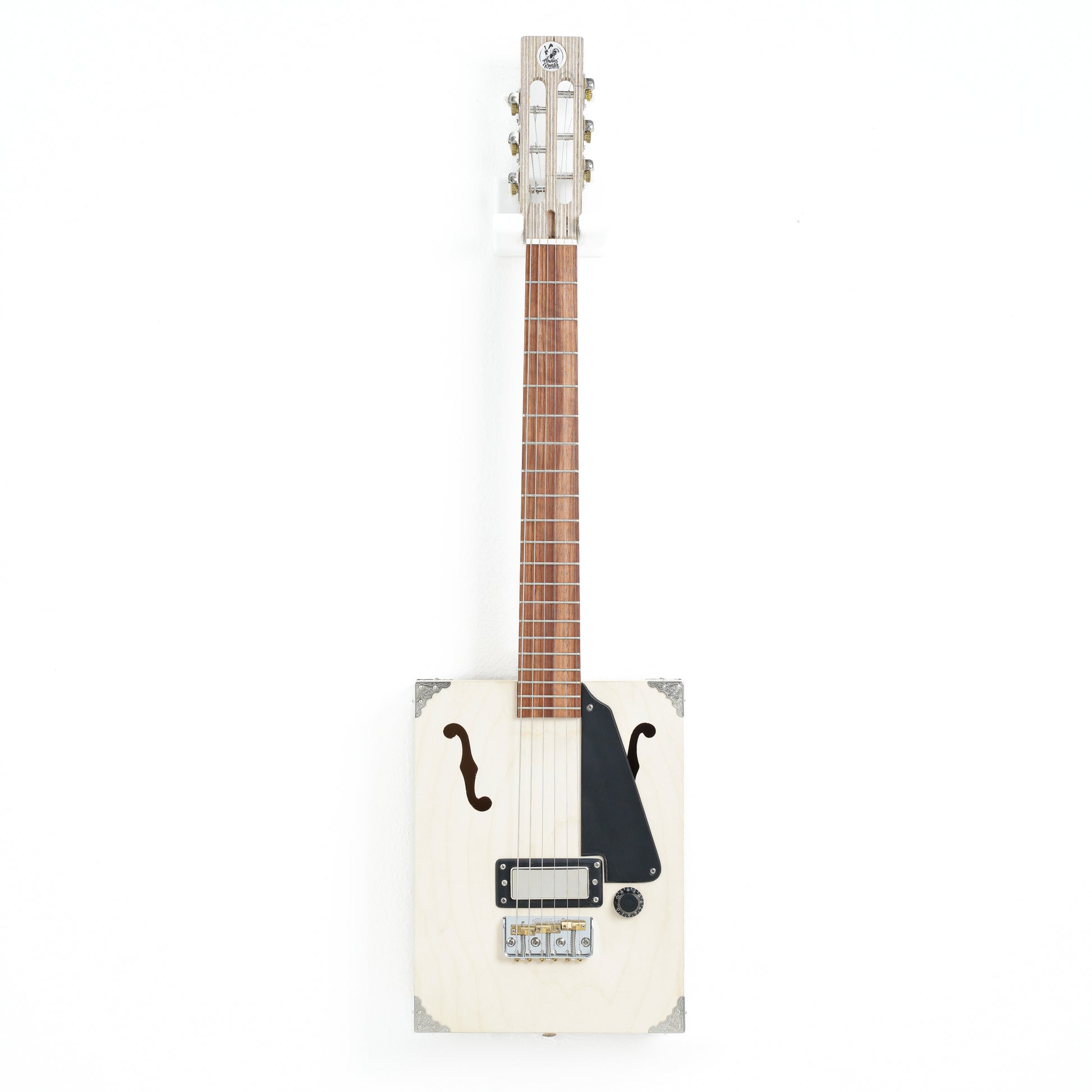 Built from our Cigar Box Guitar Kit, ready to be finished.
